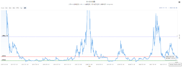 該指數用於評估比特幣價格的高低,判斷合適的購買時機。數值<0.45為抄底區間;0.45-1.2為定投區間;1.2-5為牛市區間;>5為高風險區間。當前數值為0.98,處於定投區間。