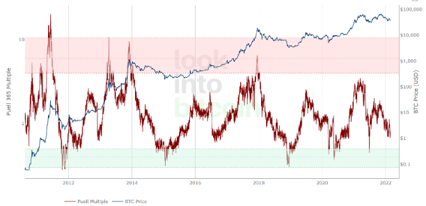 該指標顯示,比特幣再次回落到綠線附近(買入區域)。