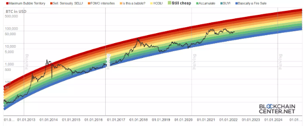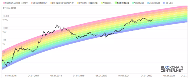 以太坊彩虹帶處於"便宜”區域和“山寨季”區域之間。