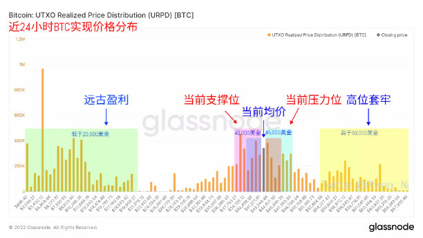 截止到今天早晨9點的BTC持倉價格分佈,可以發現市場在周末時候的冷淡性,兩邊的極端價格下,遠古持倉有少量的變化,高位套牢沒有任何的變動。這並不是說這些持幣者對於後市都很有信心,而單純的就是因為周末不願意去交易而已。接下來就是40,000美金下方的獲利籌碼,幾乎沒有佔比的變化。