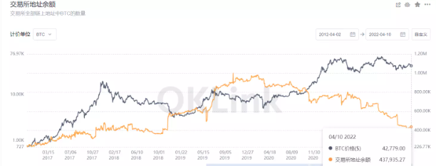 近兩個月來,BTC交易所餘額從56.8萬枚最低降至42.2萬枚。近期小幅上升至43.7萬枚。