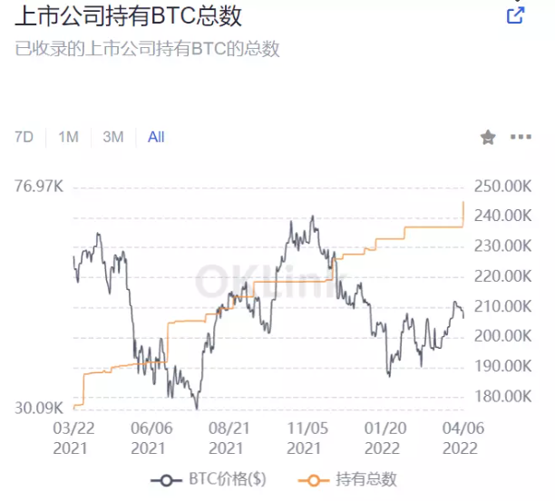 儘管BTC價格遠低於歷史高位,但上市公司持有的BTC總數比去年5月份增加了4萬多枚。