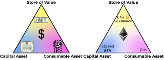 當ETH被質押時,它變成了一種資本資產,因為它能產生收益,可以根據其預期回報進行估值,類似於債券;當ETH被用作支付交易的gas時,它扮演著消耗性資產的角色,類似於使用美元納稅;當持有者將ETH存入Aave 或Compound等DeFi 協議作為抵押品時,ETH起到了價值存儲的作用。