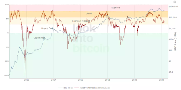 在信心高而價格低時(綠色區域)投資比特幣具有較高的風險回報;反之,在信心低而價格高時(紅色區域)投資比特幣將產生虧損。