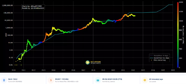 根據該模型,BTC當前預估價格應該在10萬美元上方,目前實際價格不到41000美元,偏離較大。若該模型有效,價格處於嚴重低估狀態。