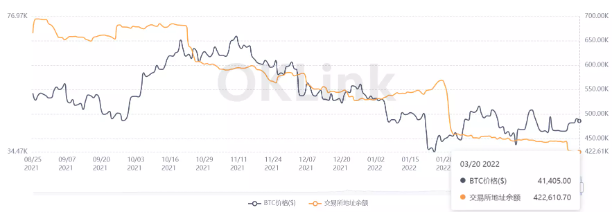 近兩個月來,BTC交易所餘額從56.8萬枚降至42.2萬枚。