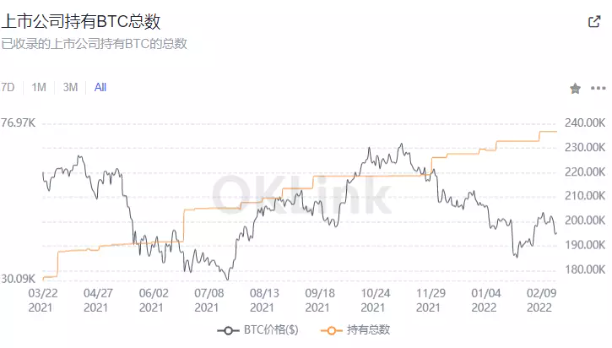 儘管BTC價格遠低於歷史高位,但上市公司持有的BTC總數比去年5月份增加了4萬枚。