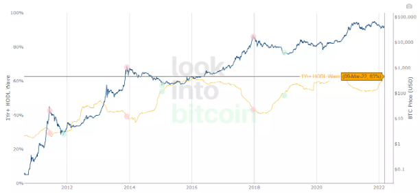 在2013年和2017年的兩次牛市見頂時,該指標分別是237%、134%。本輪牛市,比特幣漲至4.7萬美元的時候,該指標最高達到108%,繼續漲到6.4萬美元的時候,該指標反而降到了34%。目前,該指標為-6.29%。