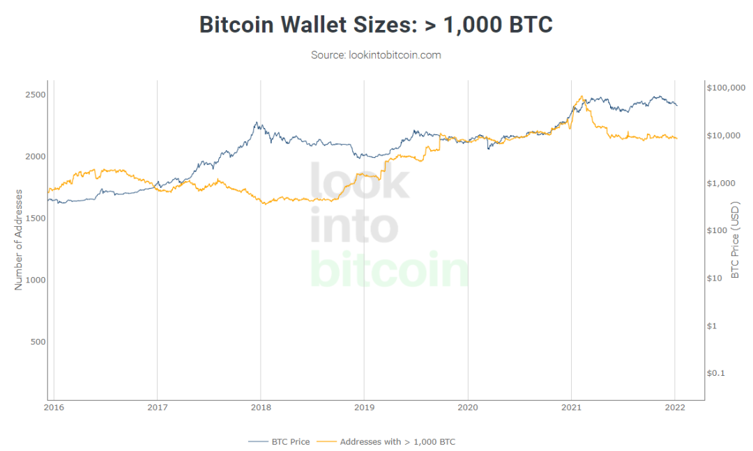 從上圖可見,2021年2月8日(當時比特幣約43500美元)巨鯨數量到達最高點2490個。在比特幣經過將近一年時間的漲漲跌跌之後,目前巨鯨數量已經降至2145個,而比特幣價格約為42000美元。去年2月8日到5月21日,部分巨鯨已經完成明顯的減倉動作之後,巨鯨數量開始進入橫盤震盪區間,而比特幣在承受住巨鯨拋壓之後,價格底部也在慢慢抬升。
