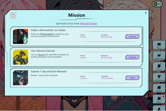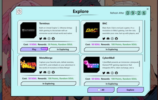 7.点击右侧explore,这里是主要玩法。完成任务后得到的灵魂,可以在这里花费进行各个元宇宙世界的探索,以此获得更多的灵魂和积分。目前积分算是主要产出货币,日后如何与nft以及铭文换算还需要进一步关注。