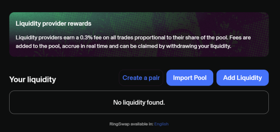 3.左上角Pools为ring的主玩法,可以理解为质押价值1比1的eth和USDB来建立一个大彩池,事后根据你占据彩池的比例来分发ring代币。create a pair和add liquidity功能一致。import pool是让你确认哪些币能和eth配对进彩池。目前只有usdb