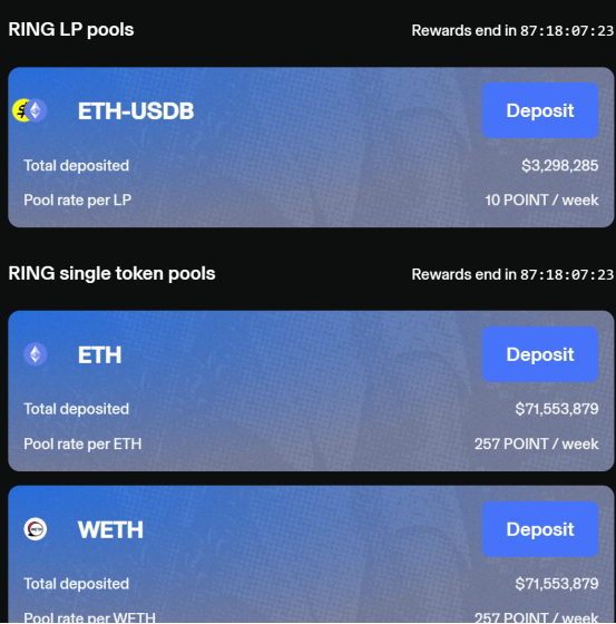 整体来说ring的玩法简单粗暴,因此为目前Blast主网积分第一dapp。不过较为影响主网的积分获取,适合eth余额较多且看好blast主网长期发展的玩家。从短期撸毛角度考虑,可以在这里兑换usdb后并不造pool也不质押,在主网获取比同价值eth更高比率的主网积分。