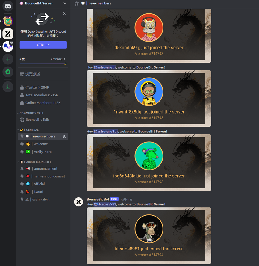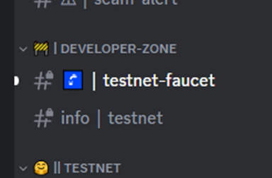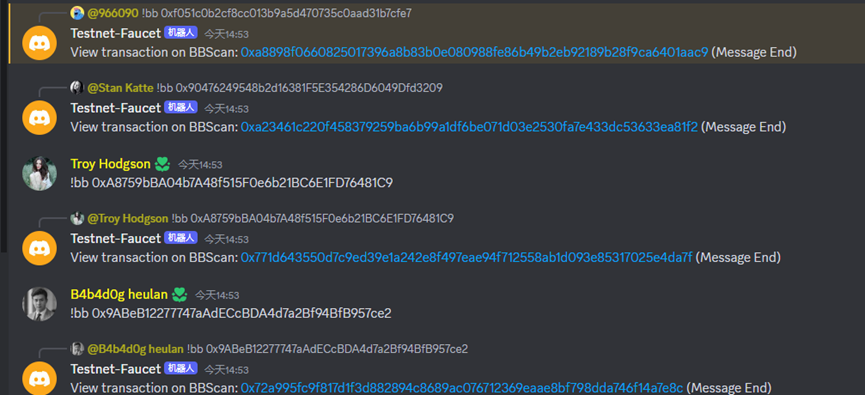 然后左侧出现蓝色测试网水龙头,点击进入,发送 !bb+空格+对应的钱包地址就可以领取了