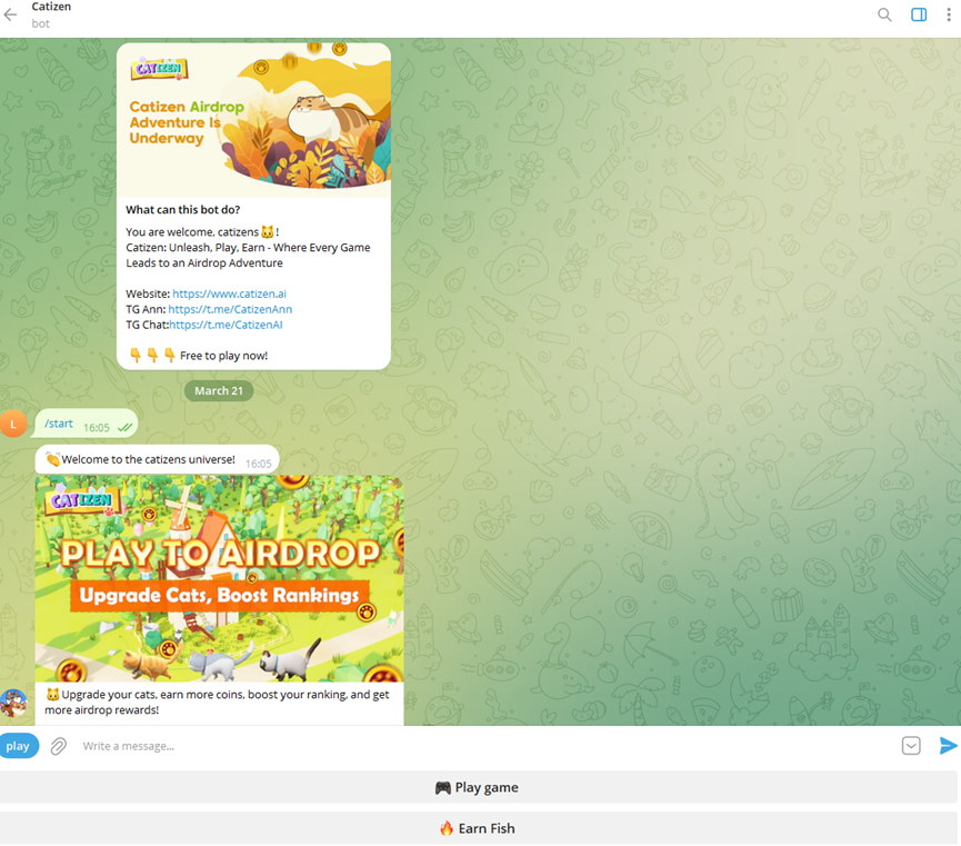 Catizen是基于电报的小程序游戏,形态与微信小程序极为类似。创始人团队原先就是以开发微信小程序为主。现在傍上了Ton的大腿,积极向web3概念靠拢。