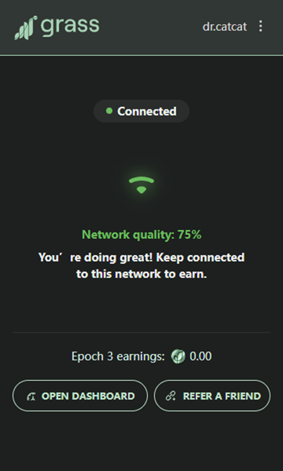 5.等待积分。目前市场对grass积分很看好,都认为可以上大所,并且场外已经开始有交易了。最重要的是,grass挖矿真的很省力,只需要浏览器打开,插件打开,连接,剩下的就是坐等收分..