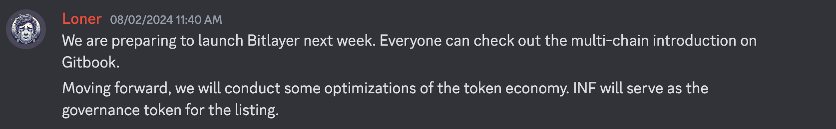 目前看下来项目方还是一个挺爱折腾的团队,整个 $INF 生态也雏形初见,最近正在紧锣密鼓的开发 NFT 质押、INFDEX Game 、Bitlayer 上的部署。对于 $INF 的最终细则目前还未公布(可以确定的是有 VC 进入, $ING 占有很大的兑换比例),大家可以进 DC 或者关注官推保持关注。