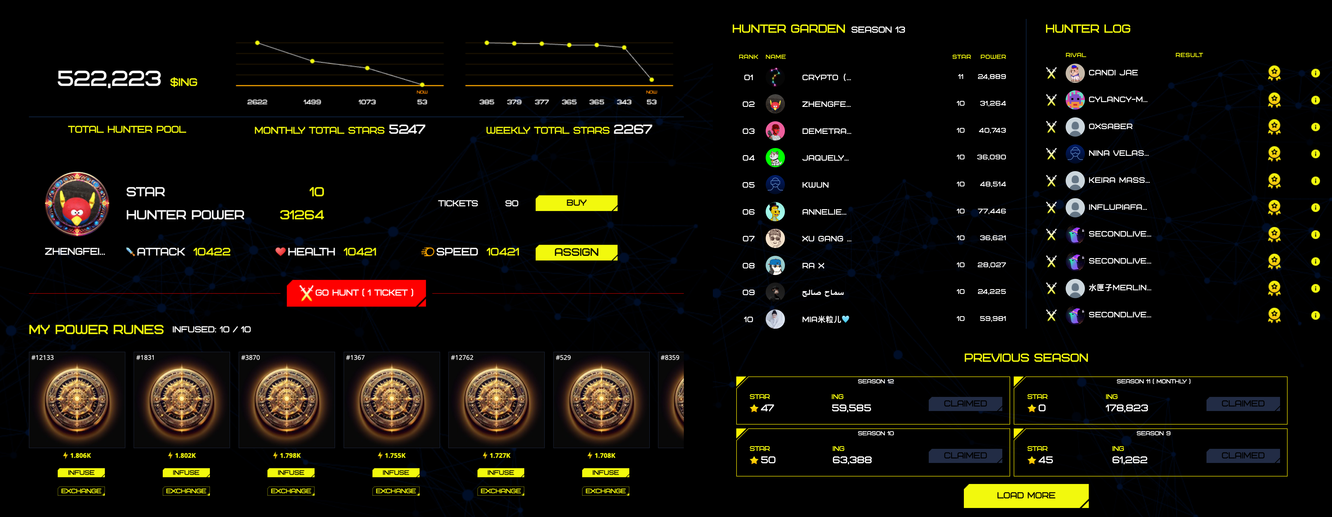 通过插入 NFT 开启 darkforest 的功能,每天最多 hunt 10 次,每周 70 次,需要购买 ticket(200 $ING 一张),详细攻略可以参考