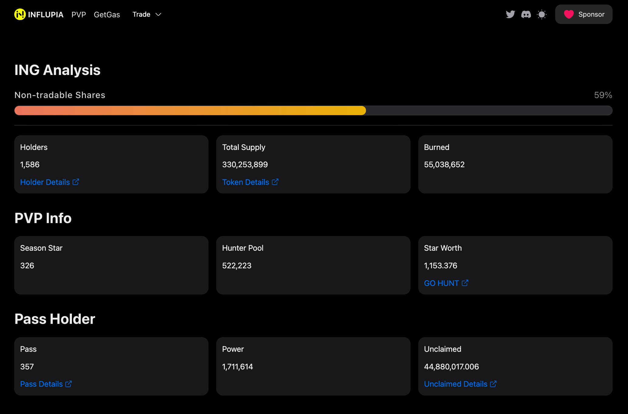 PS:小编做了个简单的 $ING 的看板,包括前 100 的 holder 地址、influpass 的属性统计、当季的 PVP 收益分析,大家有兴趣可以参考