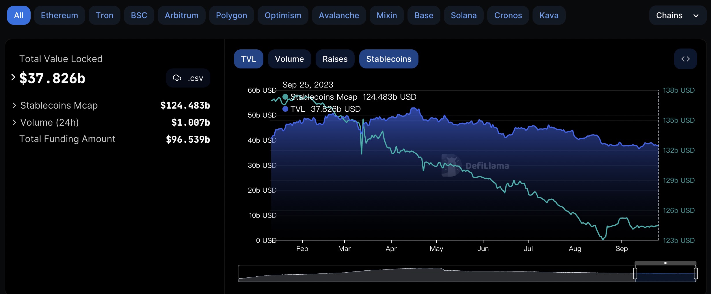 其次,我们看到的市场的总体的TVL在过去1个多月依然在持续下降(蓝色面积),但是处于平滑式下降。从3个月前的450亿下降到了当下的380亿美金。