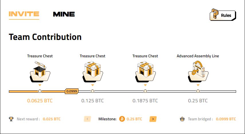 邀请了用户之后,就组成了一个团队,邀请者存入的总资产越多越可以持续贡献,并且拿到宝箱和里程碑奖励