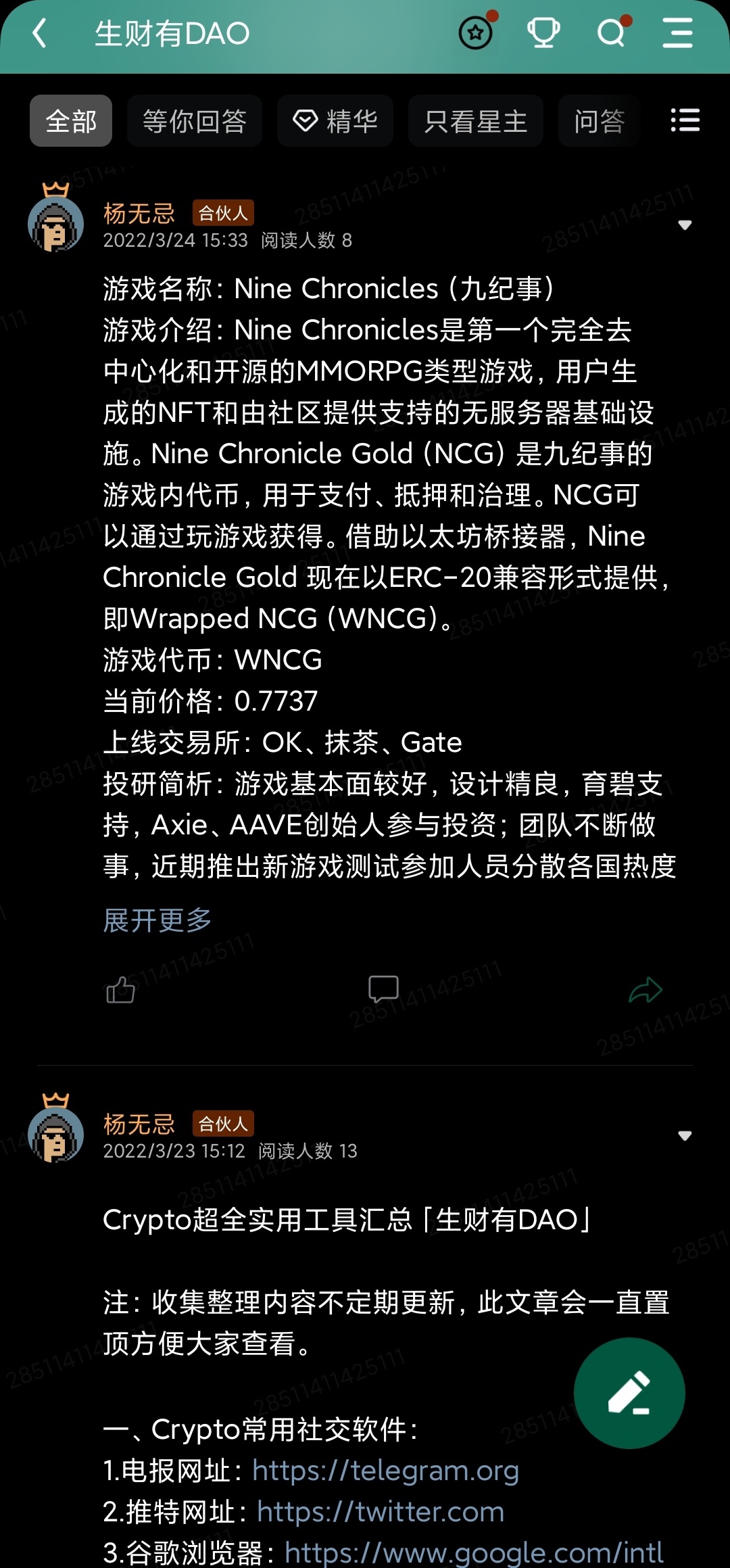 官方链接🔗: 「知识星球」 https://t.zsxq.com/a2B6iUv 「微博」 https://weibo.com/u/7735664324 「DC」 https://discord.com/invite/CqhjsfQXD7 「推特」 https://twitter.com/wwwerone1 「公众号」 生财有DAO