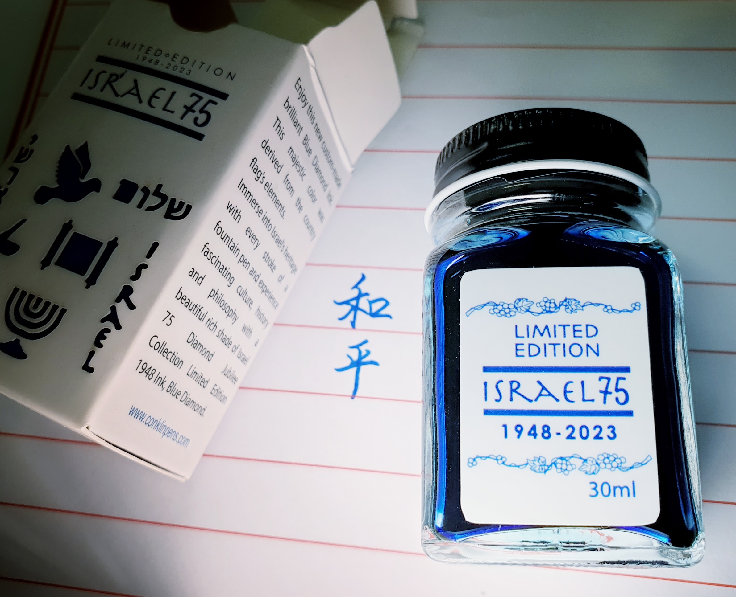 最近在「古今鋼筆」的臉書商店看到以色列建國七十五周年紀念墨水上架,由美國鋼筆公司「康其年」(Conklin)所設計生產。以色列建國於1948年,因此這款墨水只生產1948瓶,是典型的深藍色墨水,採用了以色列國旗上的藍,我覺得有很深厚的意義,因此特別訂購了兩瓶,一瓶立刻開封使用,另一瓶也許要放到很多年後才會用。 以色列是一個非常特殊的國家,位處中東,國齡不長、國土不大、人口不是最多,但經歷五次中東戰爭都能收勝,或許部分的戰爭是因為有美國甚至蘇聯在背後的幫助,但以色列人民的意志絕對才是主因。