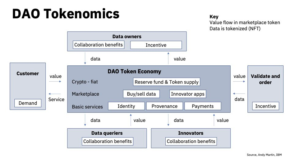 **DAO(去中心化自治组织):**这是围绕政务组织的团体,也就是一般意义上的政府。分配关系通过区块链上执行的共享规则进行协调。DAO和协议代币在生态系统中如果可以建立良好的参与度和相互关联的价值网络,那么就有可能诞生新形式的数字组织和国家。
