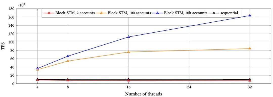 Aptos 在开源代码库中实现了 Block-STM,依靠 Rayon、Dashmap 和 ArcSwap crates 实现并发。使用非平凡的点对点移动事务(8 次读取和 5 次写入)评估了系统。