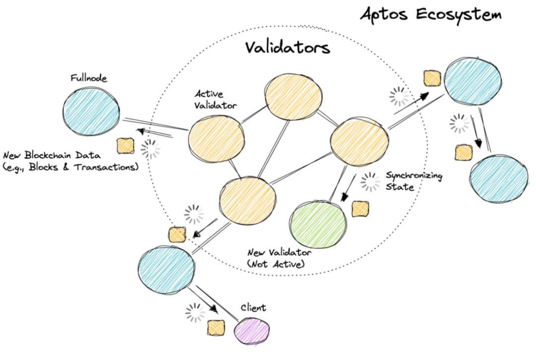Aptos 在一篇博客文章(*https://medium.com/aptoslabs/the-evolution-of-state-sync-the-path-to-100k-transactions-per-second-with-sub-second-latency-at-52e25a2c6f10*)中介绍了关于状态同步的话题,Aptos 区块链利用广泛的新技术来确保去中心化网络中的高吞吐量、低延迟验证的状态同步。在 Aptos 中,对等节点可以验证和同步超过 10k 的 TPS,延迟为低于 1 秒,而Aptos 已经朝着 100k+ TPS 迈进。