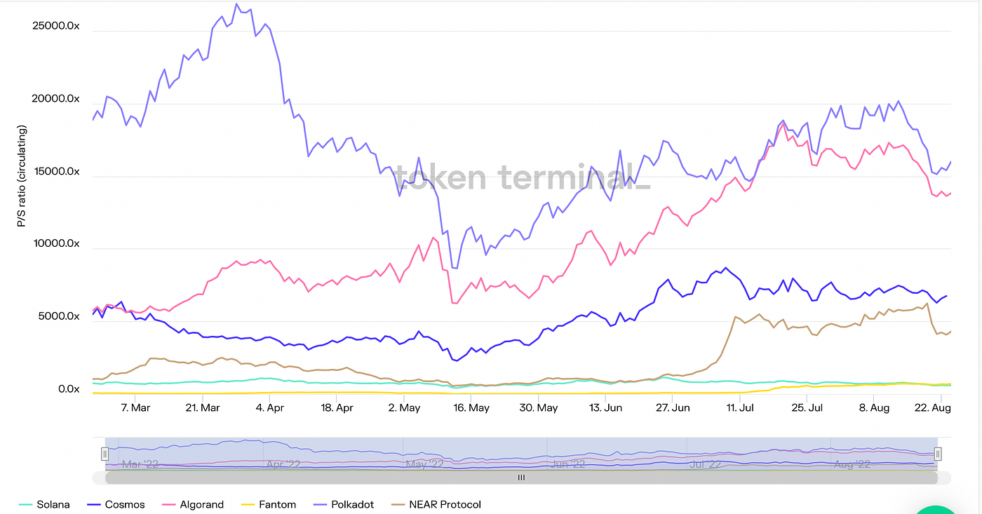 Daily P/S ratio (circulating) for Solana, Algorand, Litecoin, Polkadot, NEAR Protocol, Cosmos in the past 180 days. Source: Token Terminal