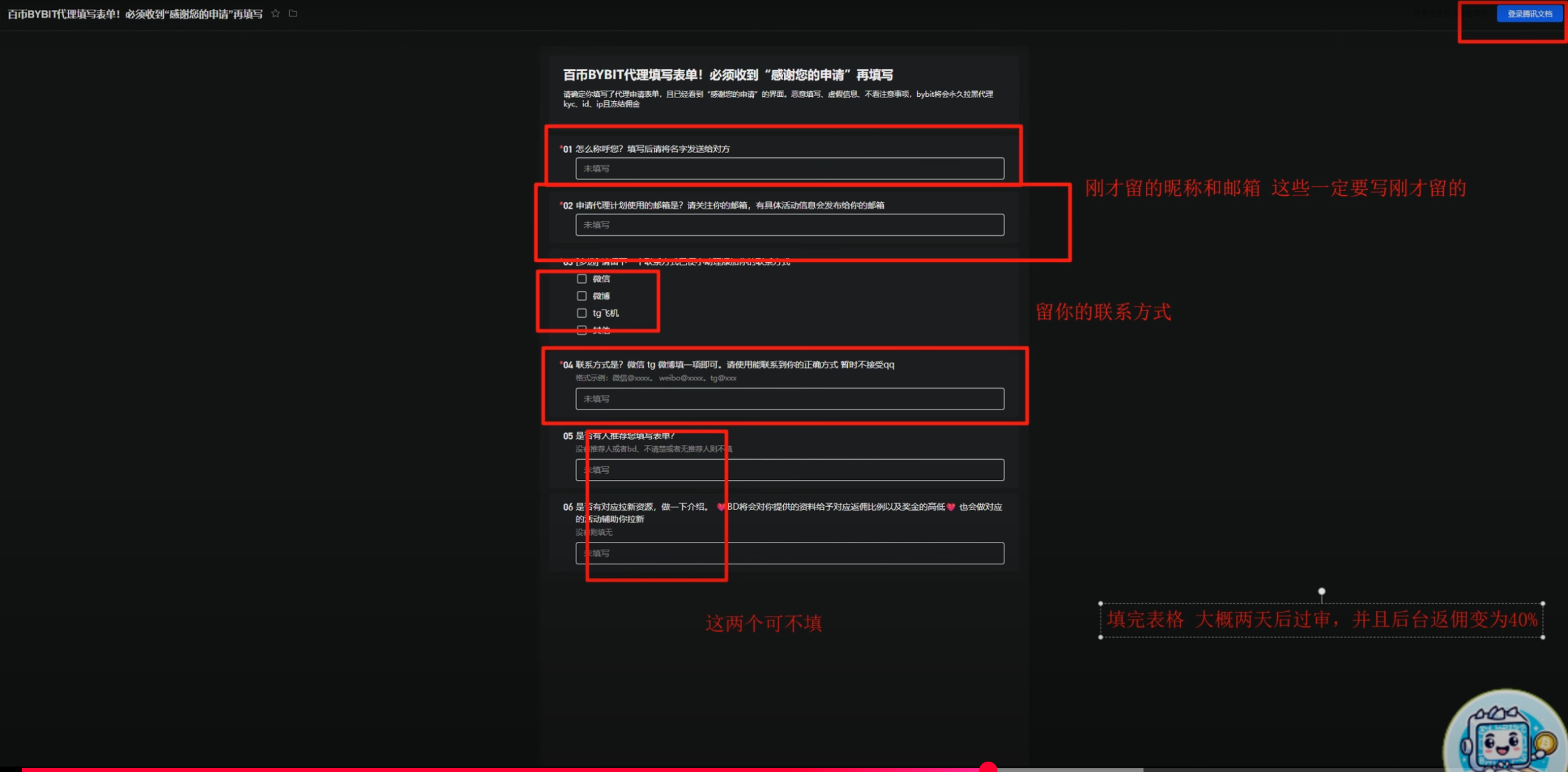 然后接下来你需要再填写一个表格,表格是简介和评论区的第二个链接,表格很简单,写你刚才留的昵称和邮箱,然后留个你得联系方式,后面的第五六条都可以不用写,填完表之后点击提交,大概两天之后你得代理审核就会通过,然后返佣比例会变为40%,如果你不填第二个表,你是无法过审的。另外记得要登录文档,才能提交表格。