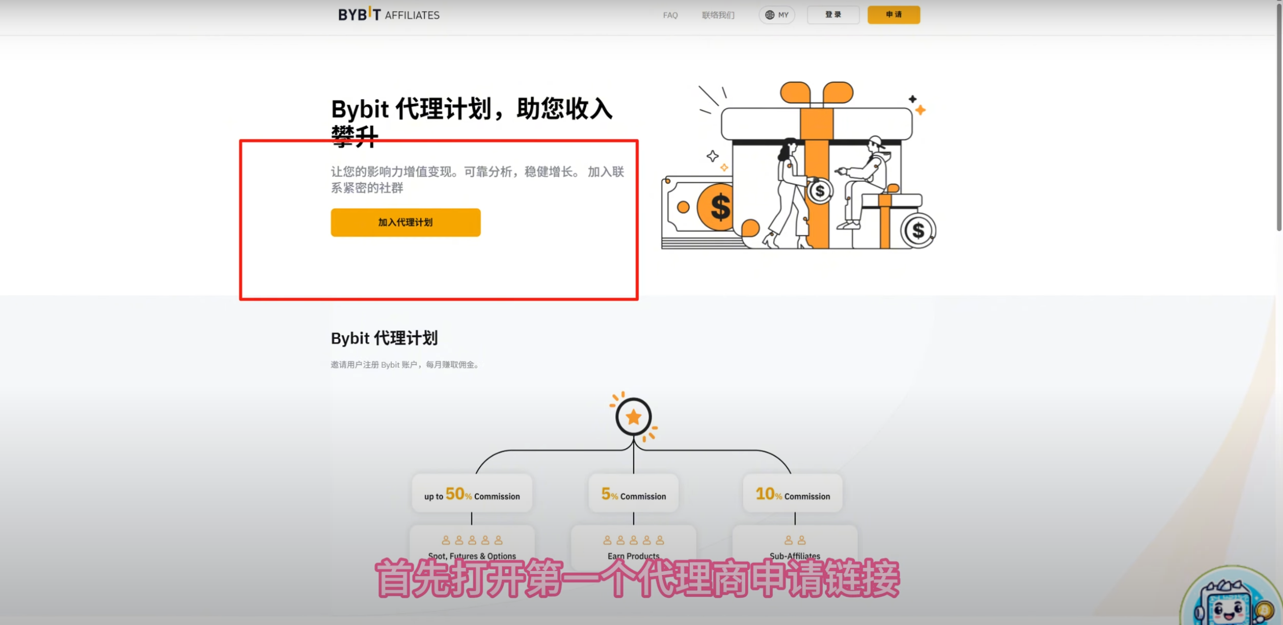 那接下来教大家如何开通Bybit代理商,我的视频简介下面有两个链接,首先打开第一个代理商申请链接,在首页我们点击加入代理计划,接下来他要求你登录你得Bybit账号,如果你还没有Bybit账户,先通过我简介的返佣链接先注册一个。