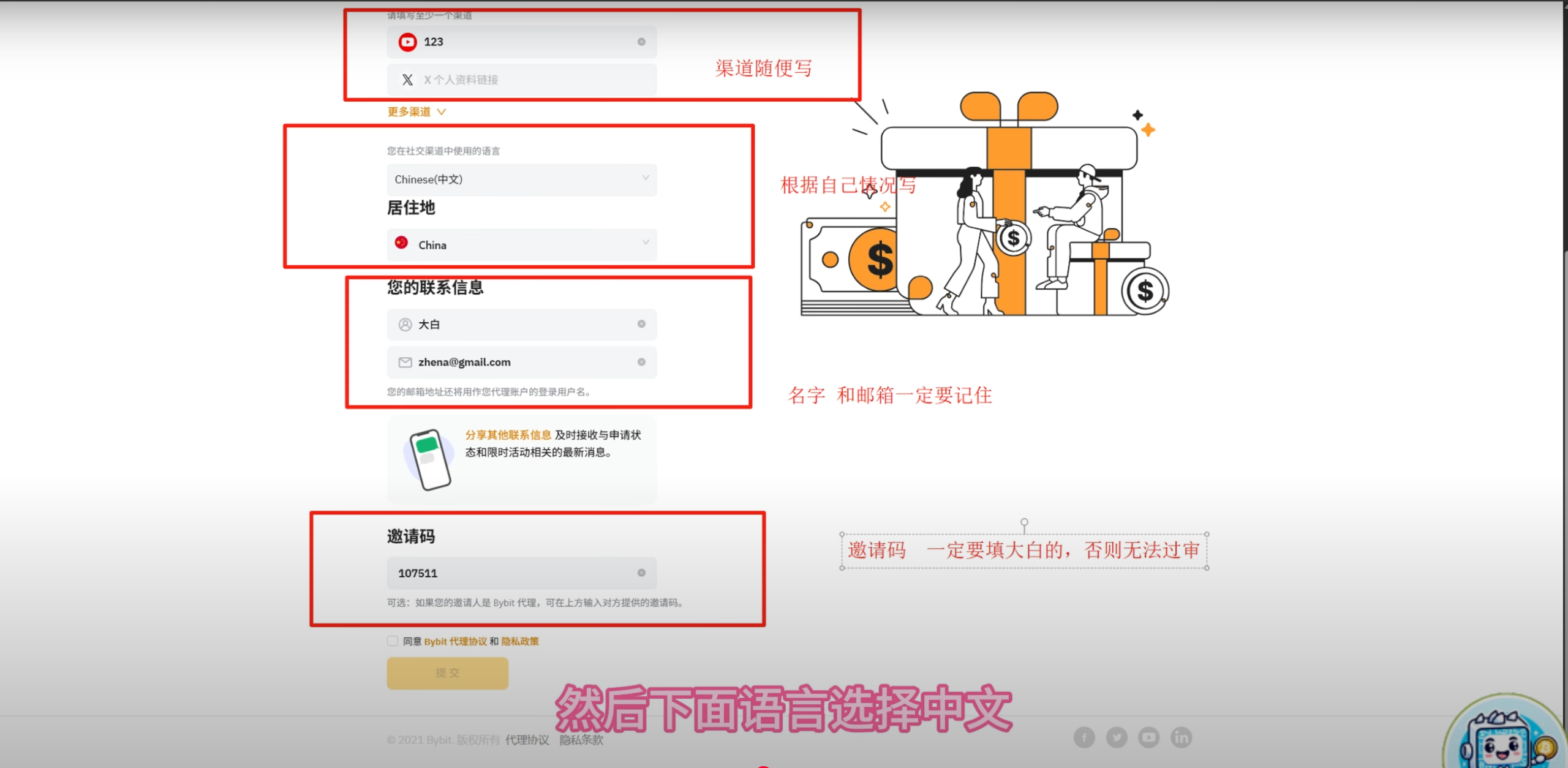 然后他要求你社交渠道必填,如果你有的话就随便填一个,有没有粉丝不重要,如果你没有的话随便写个123都行,然后下面语言选择中文,居住地根据你自己情况选择,下面联系信息,写你得昵称和邮箱,邮箱是最重要的,一定要填真实的邮箱,然后邀请码是:107511,这里邀请码一定是要留我的,官方可以快速识别,给你过审。填好之后,勾选同意协议,然后点击提交即可。然后它会显示3-5个工作日审核,