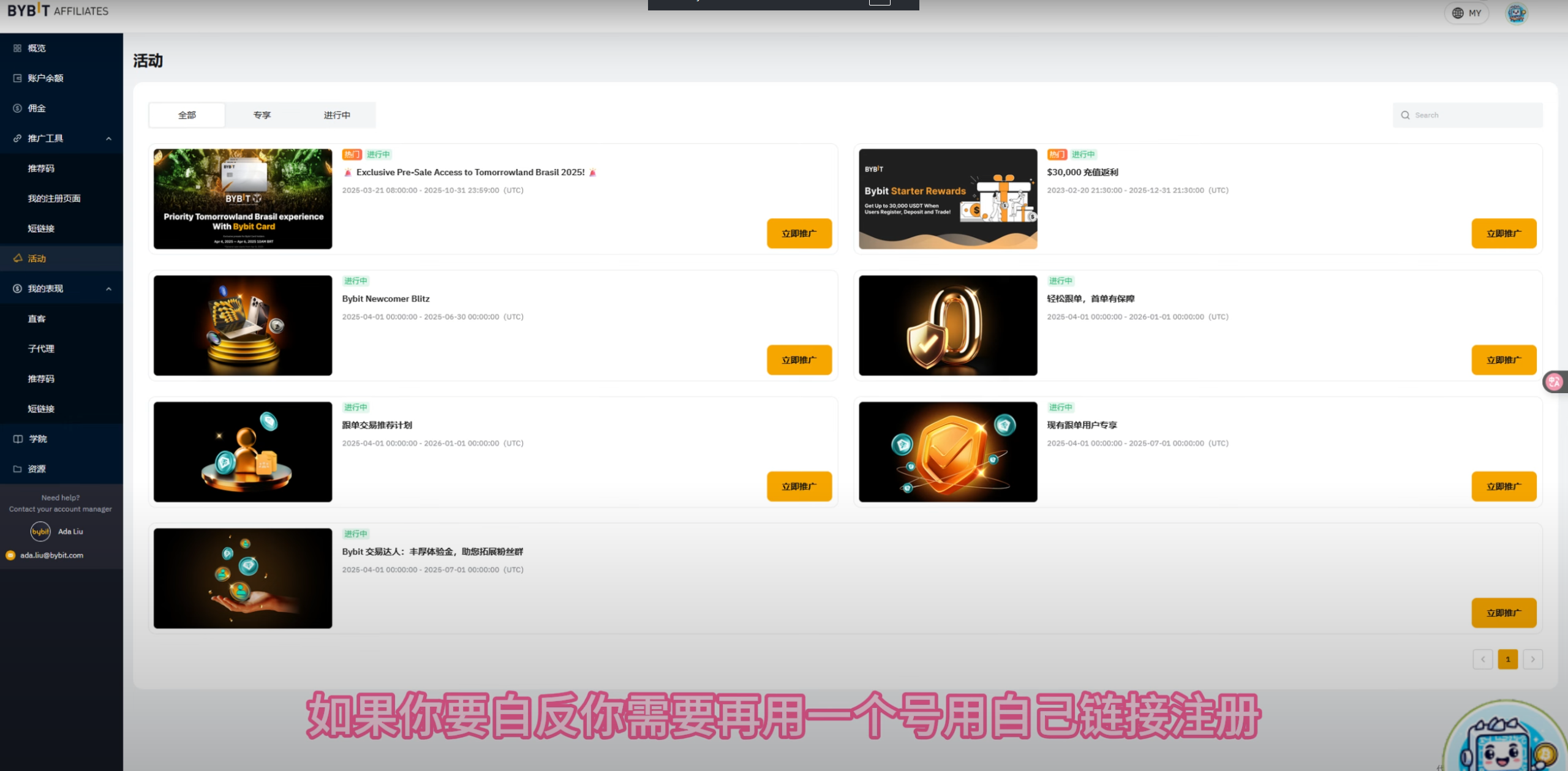 过审之后,以后就用第一个链接登录你得Bybit后台,后台可以看到你得各种推广数据,你可以给客户设置自定义的返佣比例,目前自动返现最高33%,你也可以在推广页面,看到各种再跑的活动,但是这个返佣不能自反,如果你要自反你需要再用一个号用自己链接注册。你的默认返佣比例是40%,如果你要提高返佣比例,每个月客户手续费2w美金可以提升到45%,每月5W美金手续费可以提升到50%,Bybit最高的比例就是50%,没有更高了,而且都是必须考核,我也一样。