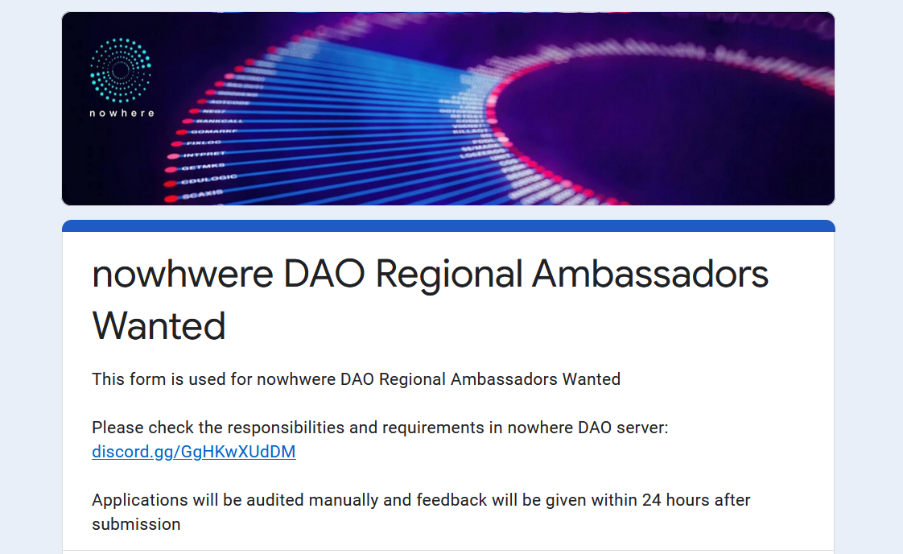 NowhereDAO Regional Ambassadors Application form: https://forms.gle/DodsdMb2TwexHaj88