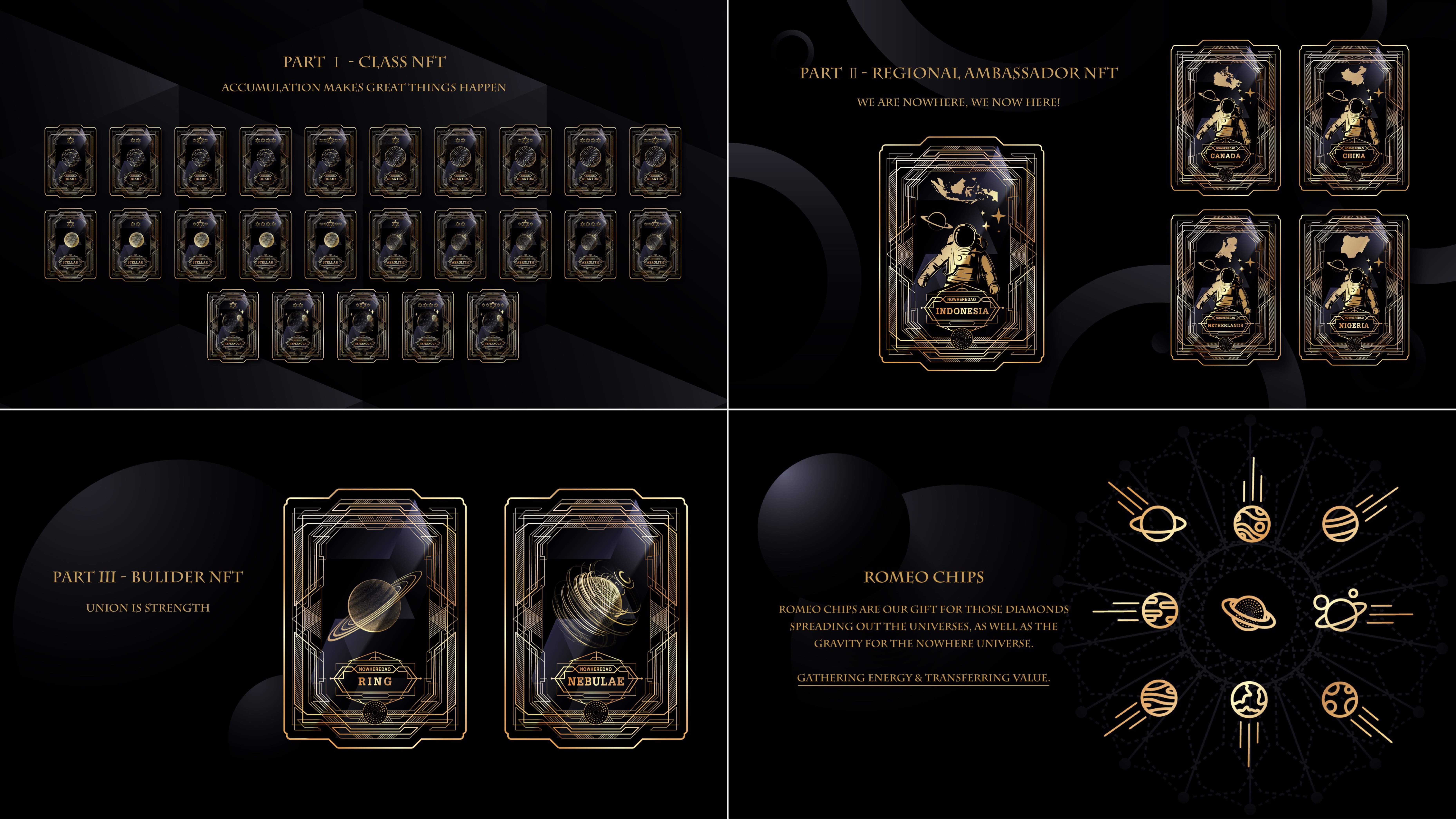 Romeo Chips are the Alpha Mission of the Nowhere, aiming to explore and locate the stars in the Web3 galaxy. This series of NFTs has a total of three colors gold, silver, and copper, and each color of NFT consists of 9 pieces, and each person can get one of them.