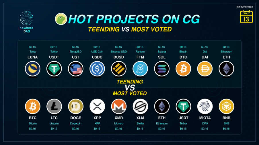 On May 13th, we updated Hot Projects on CG: Trending vs most voted. There are countless new crypto projects springing up all over the world. Please feel free to check the trending and most voted projects.