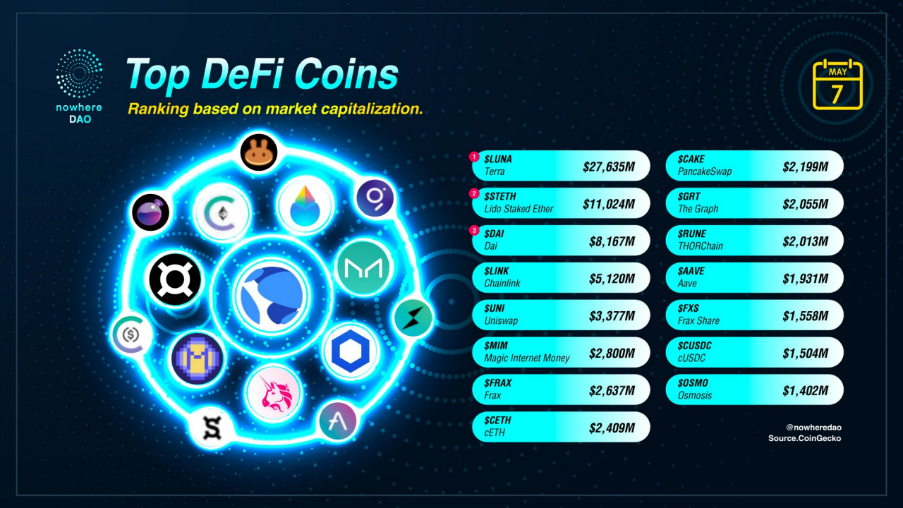 On May 8th, we updated the Top DeFi Coins on Twitter. The ranking is based on market capitalization. Nowhere DAO will build an information-sharing platform, a value project mining platform, a primary and secondary market information supply platform, an education platform, etc. Stay tuned for our future information!