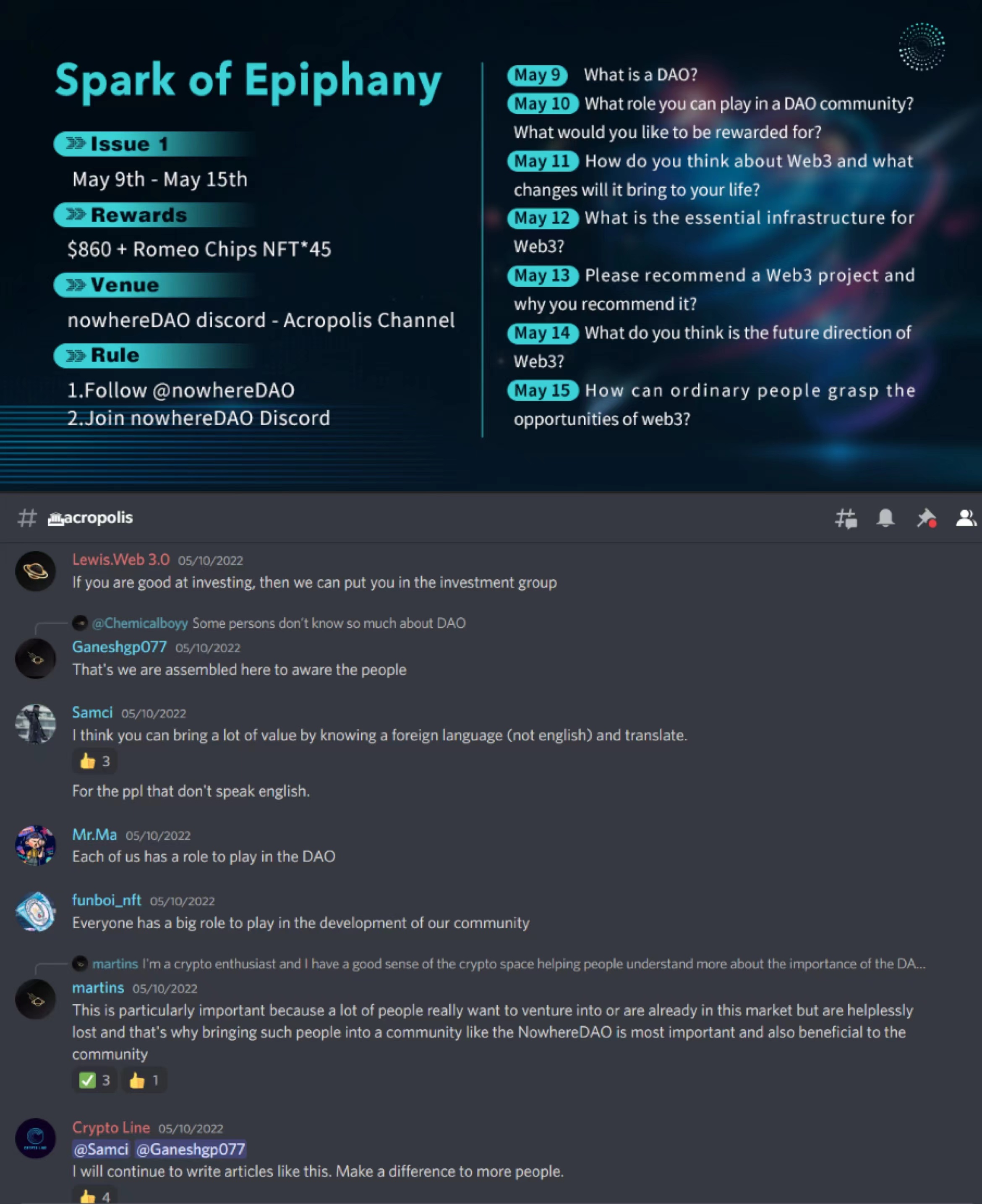 To promote communication among NowhereDAO community members, we hosted the Spark of Epiphany Activity, topics as follows. The activity was such a great success that our community members actively participated in the discussion and expressed their views on the issue.