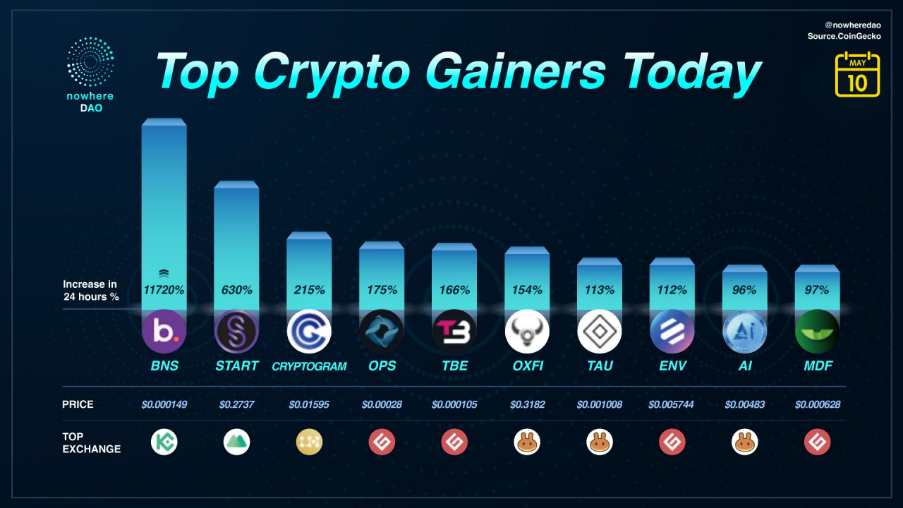 On May 10th, we updated Top Crypto Gainers Ranking on Twitter. With the increasing need that all investors and cryptocurrency lovers want to share their investment experiences freely, NowhereDAO will provide users information at a premium and crypto-market investing advice.