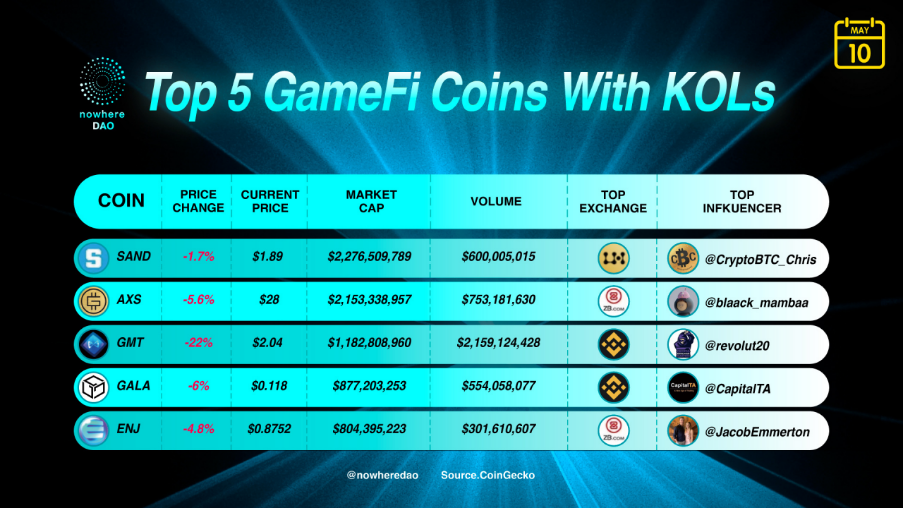 On May 11th, we updated the Top 5 GameFi Coins With KOLs on Twitter. Gaming tokens or GameFi coins are considered cryptocurrencies that have real value. The concept of GameFi coins is that you earn tokens by playing games. Check the graph below and find out what GameFi coins are on trend.