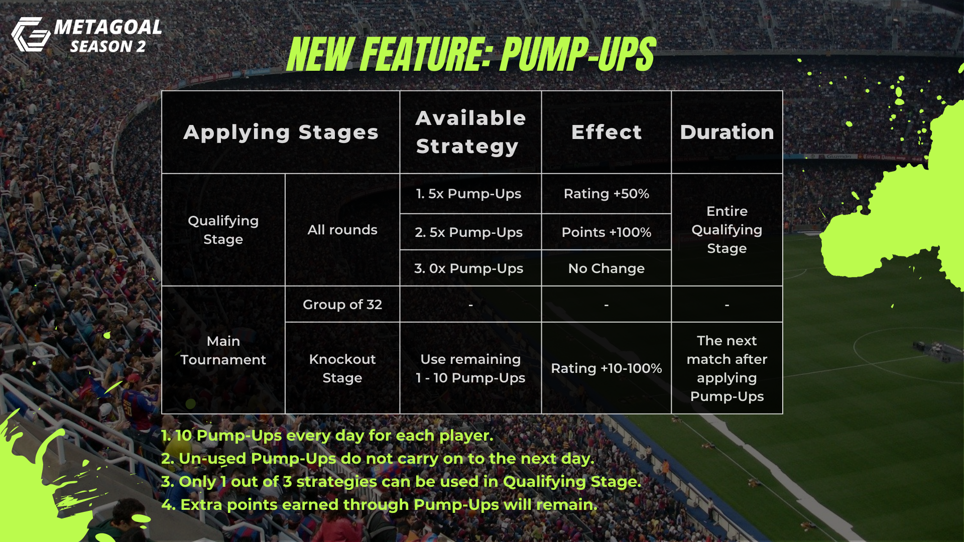 **Note:**1. 10 Pump-Ups every day for each player.2. Un-used Pump-Ups do not carry on to the next day.3. Only 1 out of 3 strategies can be used in Qualifying Stage.4. Extra points earned through Pump-Ups will remain.