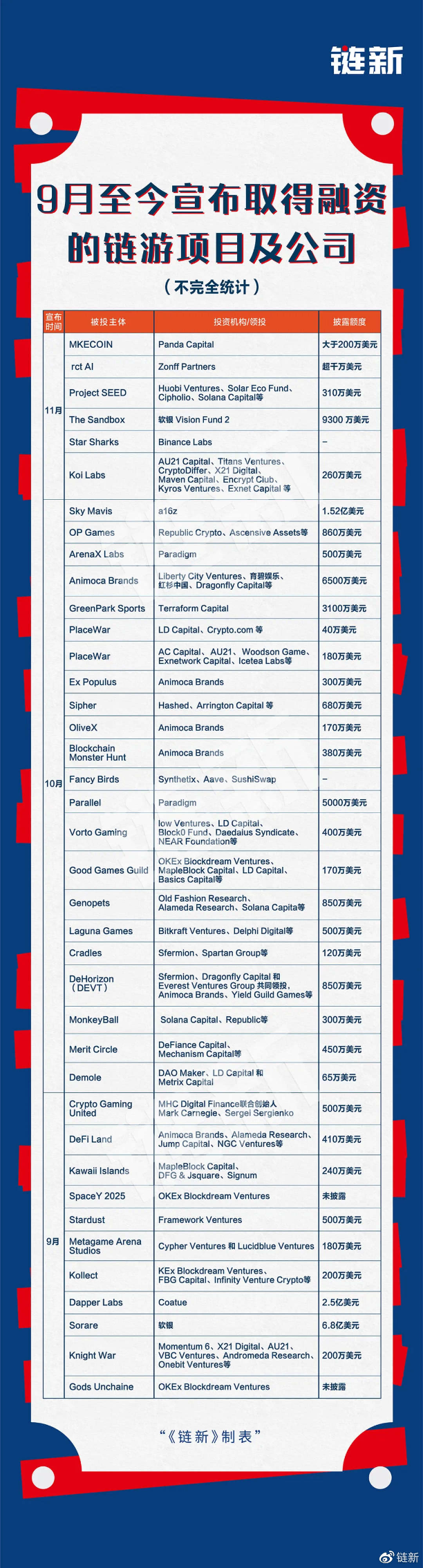 在元宇宙、NFT等概念加持下,链游仍不断升温,吸引着投资机构入场。据《链新》不完全统计,在过去一个月,有超20个链游类项目宣布取得了融资。红杉中国、罗斯柴尔德信托资本、马云的Blue Pool Capital以及三星风险投资公司等传统资本也纷纷押注这一新兴领域。