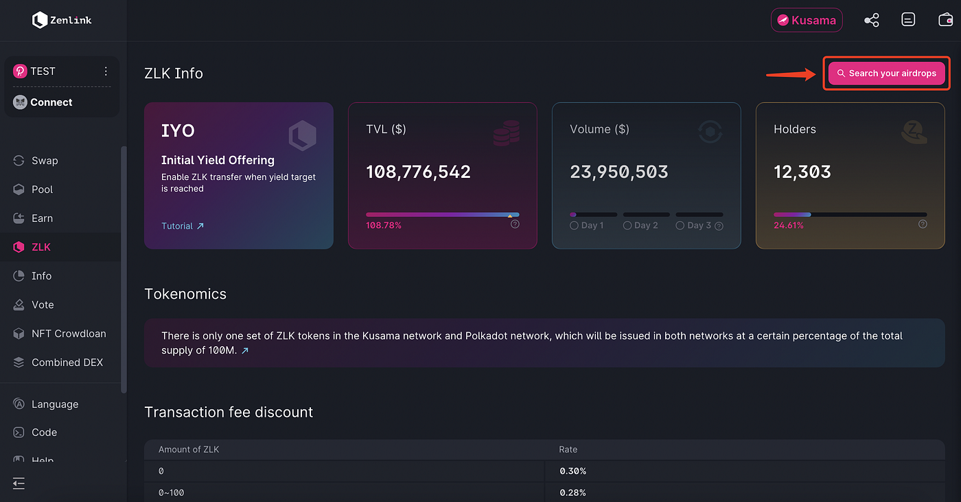 A: For all the ZLK airdrops or rewards mentioned above, users can go to the “ZLK” interface in Zenlink DEX after Zenlink DEX DApp is launched and click “search your airdrop” in the upper right corner to enter the Substrate address to see if you meet the criteria and how many ZLK tokens you will get.