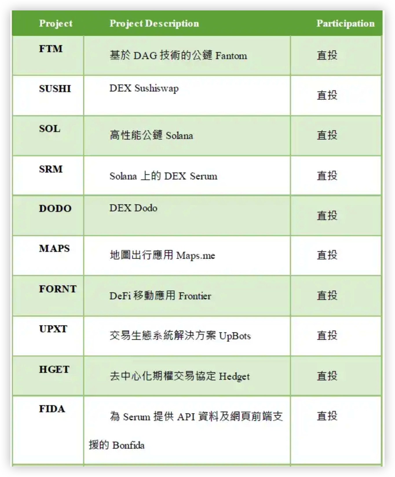 a) 直接影響層:FTX和Alameda直接投資的專案以及與FTX有直接借貸與合作關係的中心化機構。專案層面主要包括Solana、Fantom和Serum在內的重要的公鏈和DEX等,如下表所示,這些是FTX暴雷事件的直接受害者。