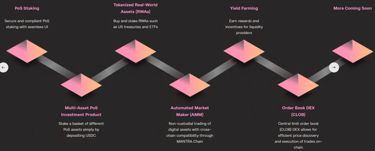 目前,推出了一些基于加密货币的收益型DeFi产品,随后将会推出中央限价订单簿 (CLOB) DEX,它将提供掉期功能和传统金融产品(如债务、股票和其他现实世界资产 (RWA)。在这些产品成功推出后,MANTRA Finance打算通过提供衍生产品来扩充其去中心化交易所 (DEX) 产品。