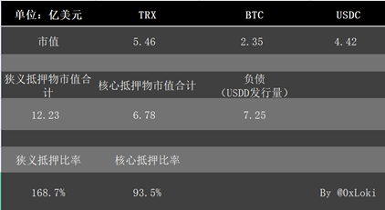 6/11这里解释一下,核心抵押比率低于100%是第一道预警线,当核心抵押比率在100%以上时,协议是绝对安全的,即使狭义抵押物(TRX)全部归零,USDD也能得到足额的资产背书。尽管USDD的核心抵押比率低于100%,但和UST的8.2%,Alameda的22%仍然不在一个数量级,不能简单地归为一类。