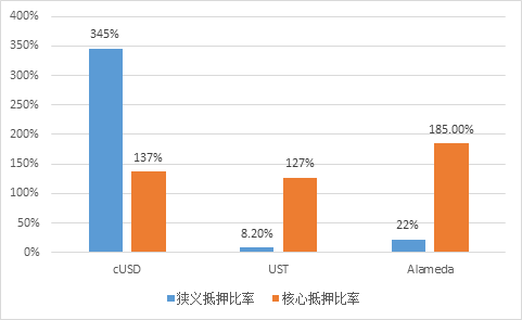 4/11在之前的分析中,我们发现Alameda的核心抵押比率仅有22%,远低于Celo、MakerDAO等协议,与UST处于相近的水平线。事实上,Alameda和UST背后的问题都是狭义抵押比率的合理性掩盖了核心抵押比率的不合理性。