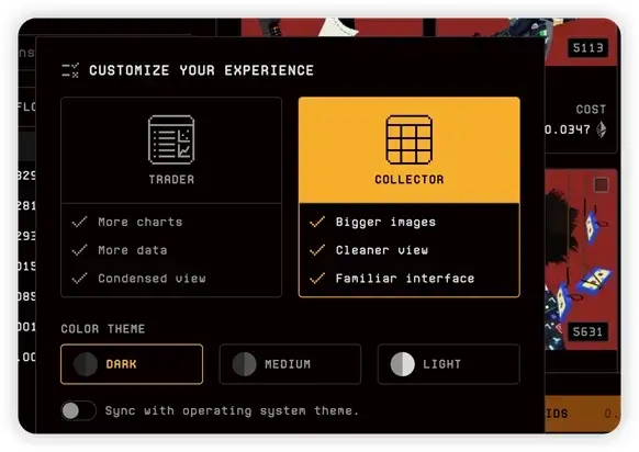 **Blur’s interface has customizable features. **When browsing the NFT collection, the display mode can be changed to either in list or in block tailored to preferences of users. Unlike OpenSea, which requires users to switch tabs to view sales history and other analytics, Blur presents everything on a single page, making it easier for users to access and compare all relevant NFT collection data. In addition, other accessibility features, such as light and dark mode, gas fee tracker and ETH feed data, are standard.