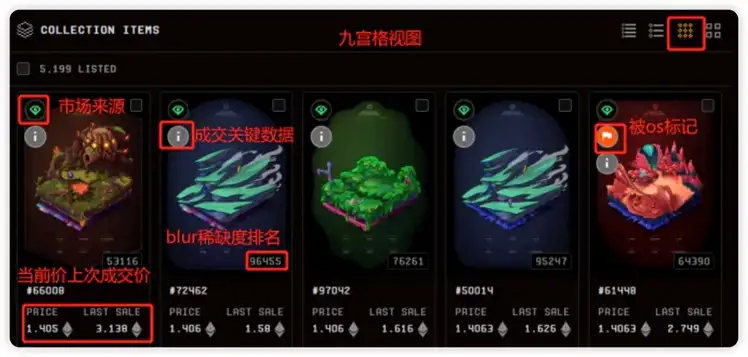 Blur does not set up a separate NFT product detail page like other NFT trading marketplaces, but rather a drop-down menu that lists key information about the transaction that is critical to the transaction, such as current price, floor price, current holder and number of holdings and shelf time. Moreover, the percentage of each NFT with special attribute, current floor price and last price sold are also contained.
